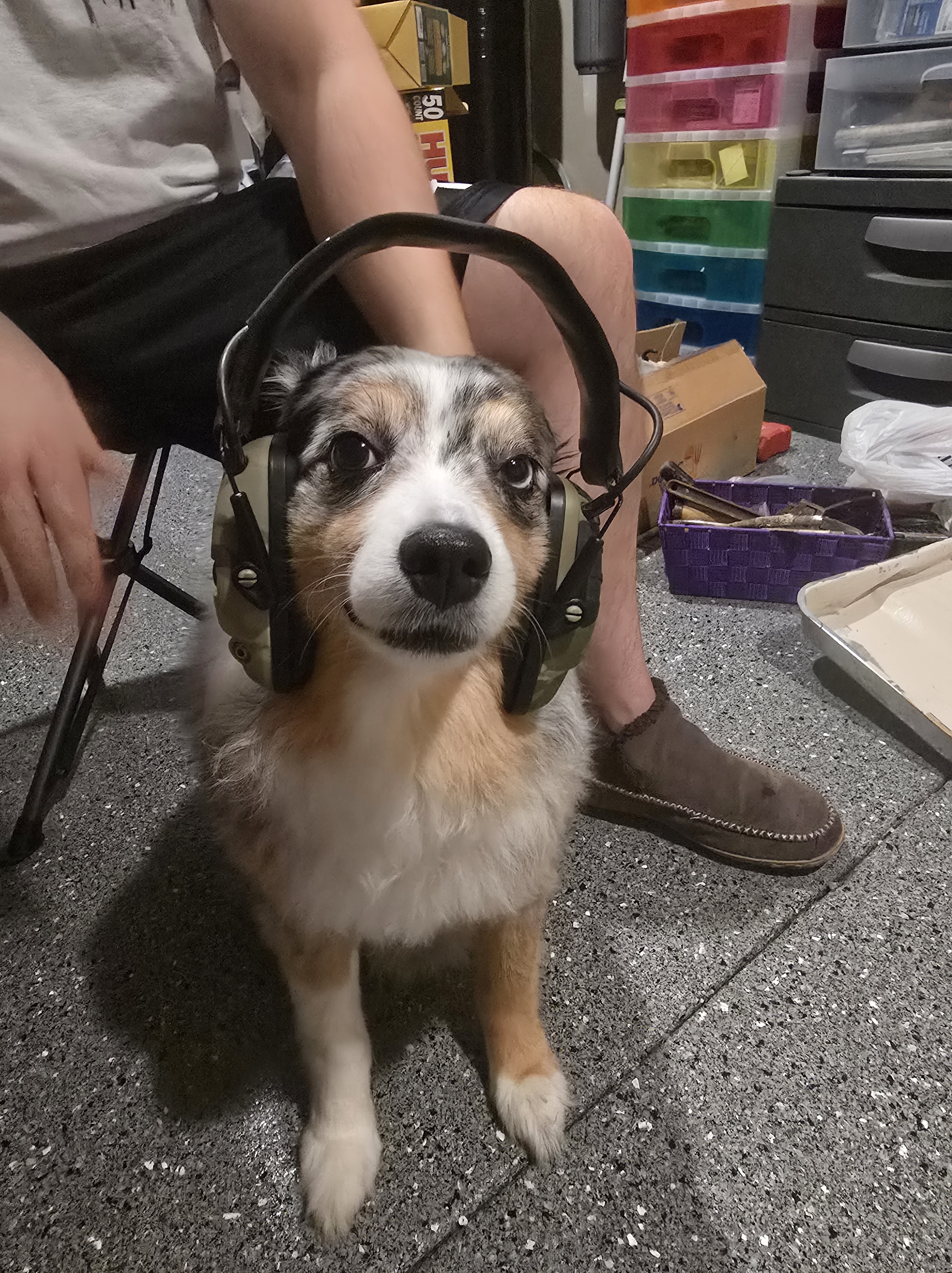 With all the drilling and cutting, my little munchkin needed to protect his ears. I know how hard loud noises can be on them, but he refused to stay inside the house. Meet Rudolph!